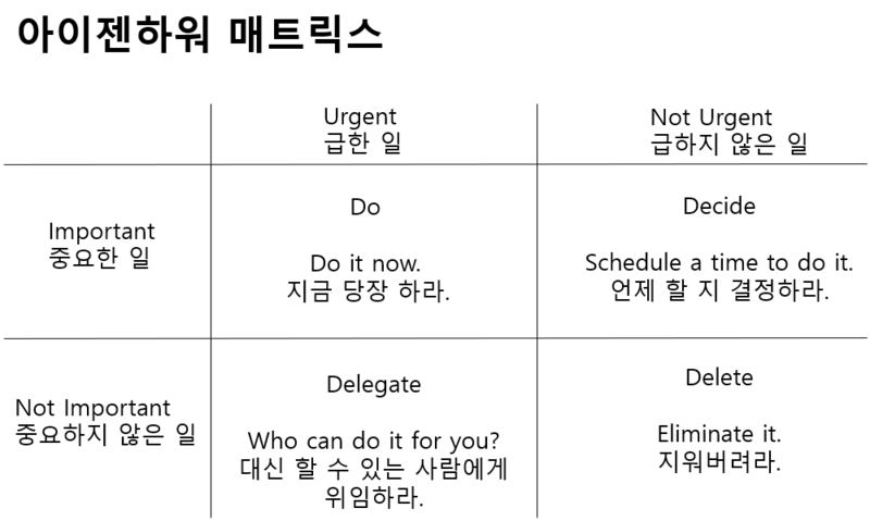 먼저 가장 간단하고 효과좋은 아이젠하워 매트릭스로 시작한다.